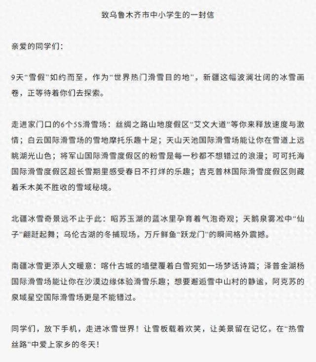 10月26日,新疆维吾尔自治区文旅厅官微“新疆是个好地方”发布消息:2025年12月1日至5日,乌鲁木齐市中小学生将迎来“雪假”,加上11月29日、30日和12月6日、7日两个周末最长可达9天假期。