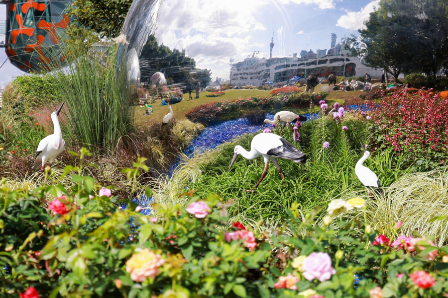 作品选用了大量应用在杭州高架上的网红“西子系列”月季,团队通过花期调控技术,确保月季在花展期间集中盛放,呈现最佳观赏效果。同时搭配狼尾草、粉黛乱子草等观赏草,其随风摇曳的姿态能更好地呼应黄浦江江景,增添自然野趣。