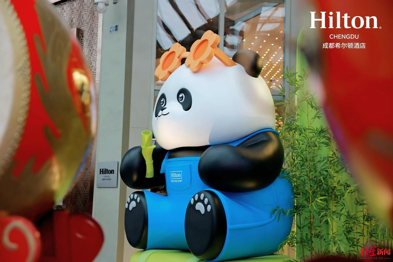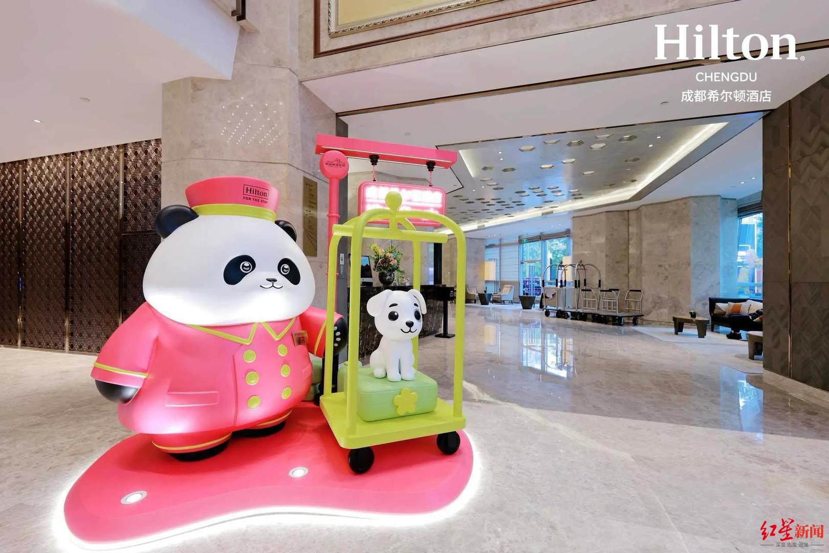 成都希尔顿酒店焕新启幕之际,特别邀请了希尔顿“宠你体验官”大熊猫花花“站台”。酒店空间内设置了两处特别定制的大型主题装置:“勤快花” 推着宠物行李车活力迎宾,“度假花” 则戴着墨镜悠然倚坐于行李箱上。酒店还推出了熊猫花花主题客房,从拖鞋、浴袍、床品到儿童帐篷,均以花花形象为灵感进行定制设计。