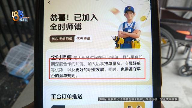 “万师傅”平台客服:加入全时师傅前,这些服务类目和价格都有公示,师傅需要看了后,才去决定是否要加入全时师傅。如果一旦选择加入,就代表他已经认可了这个规则。平台比较重视师傅的感受,目前我们已经跟师傅沟通了,取消这个处罚。